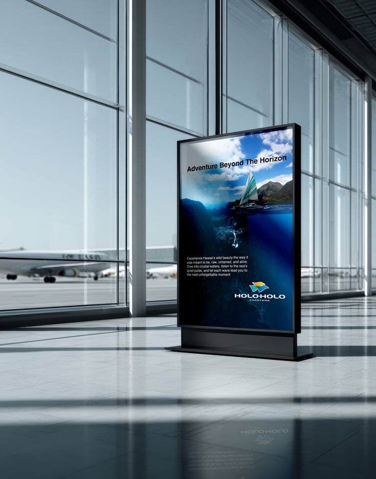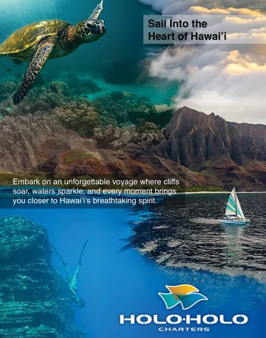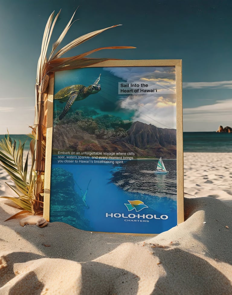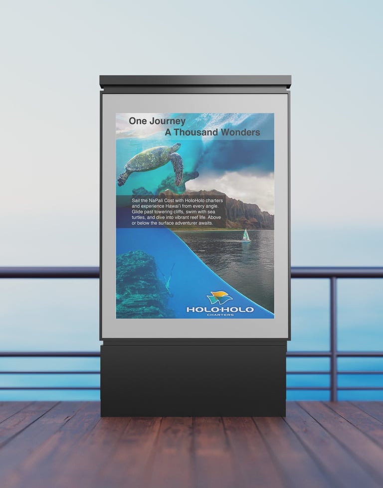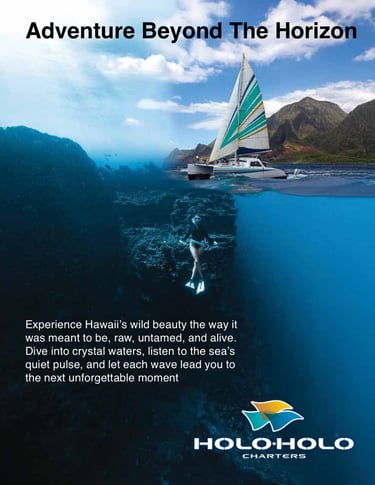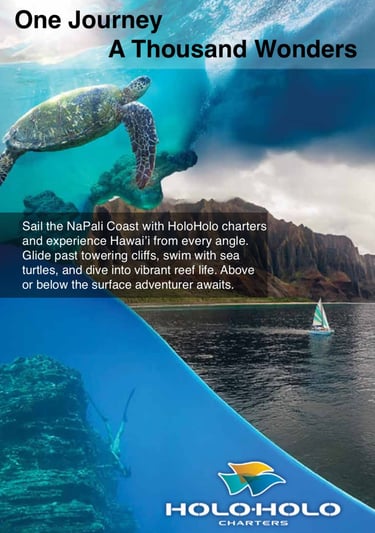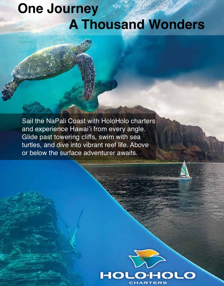 HoloHolo Charters is based on Kauai and is an ocean tour company that offers sailing adventures along the island’s breathtaking Nāpali Coast, allowing travelers to experience Hawai‘i both above and below the surface, from snorkeling with sea turtles and exploring coral reefs to cruising past towering cliffs and hidden waterfalls. The purpose of my project was to design a print advertising campaign that visually captures this sense of exploration and wonder, showcasing HoloHolo’s blend of adventure, natural beauty, and authentic Hawaiian spirit. Through three posters, the campaign invites travelers to see the island from new perspectives, reinforcing HoloHolo Charters as the premier way to discover the heart of Hawai‘i.