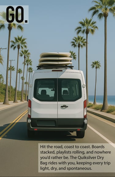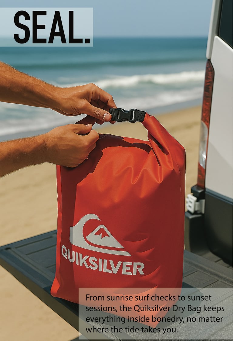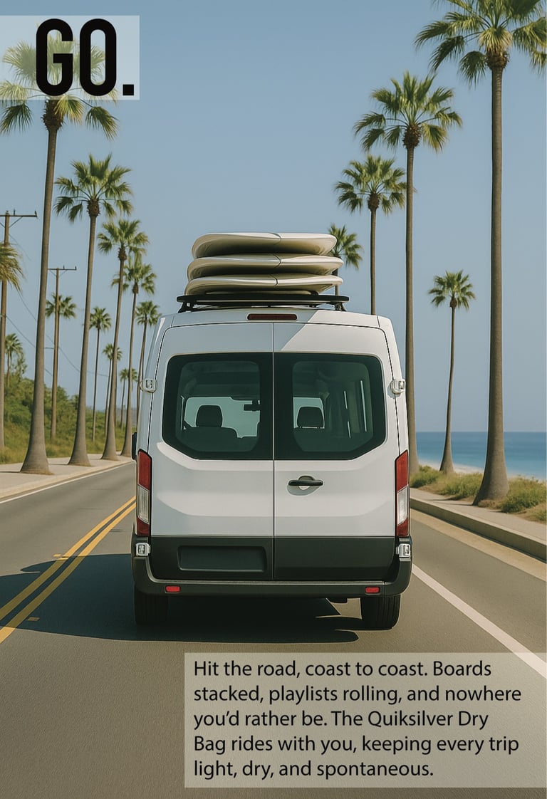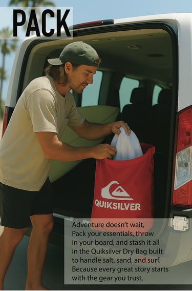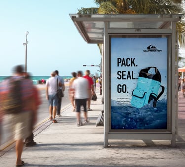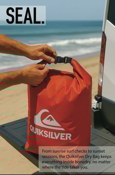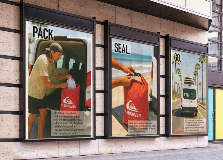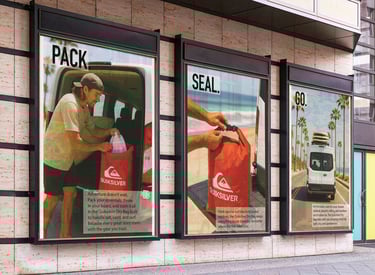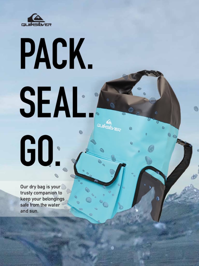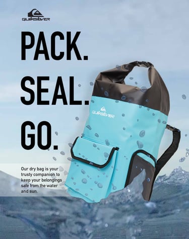 Quiksilver is a globally recognized surf and lifestyle brand that embodies the spirit of adventure, freedom, and connection to the ocean. The purpose of my project was to design a bold and minimal print campaign promoting Quiksilver’s new waterproof dry bag, a product made for surfers, travelers, and outdoor explorers. Centered around the tagline “PACK. SEAL. GO.”, the campaign captures the brand’s energetic, go anywhere attitude while highlighting the bag’s durability and function. Through clean layouts, striking imagery, and action-driven typography, the project reflects Quiksilver’s identity as a brand built for those who live boldly and chase every wave.